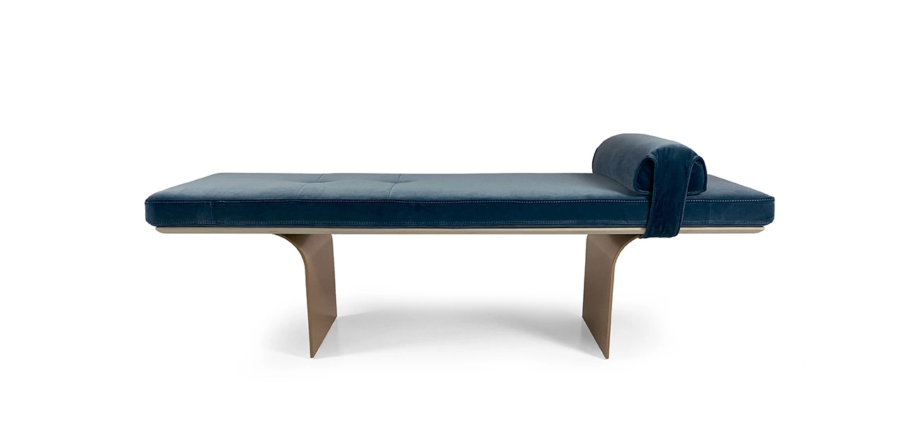 Element charakteryzujący się prostym, ale urzekającym designem, w którym oszczędny styl podkreśla szlachetność materiałów, a detale wyróżniają się w poduszce i wypełnieniu osadzonym na konstrukcji, która wydaje się unosić w powietrzu dzięki podstawie wykonanej z dwóch zakrzywionych metalowych płyt.